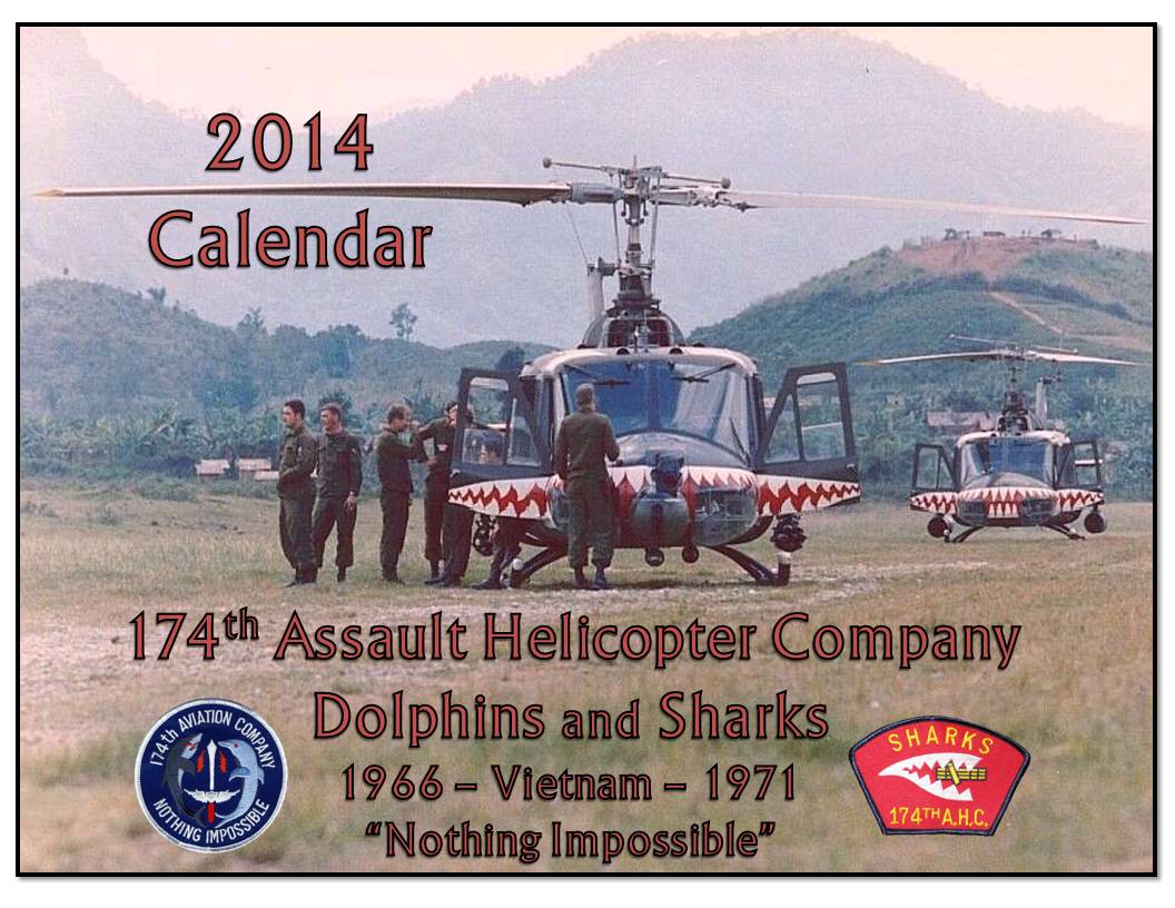 A 2014 calendar has been designed and published, highlighting the 174th AHC. The calendar is 11" X 8.5", full color, horizontal format, designed to be hung with a full-page color photo on top and a monthly calender below. The calendar includes all 63 names of 174th soldiers killed in Vietnam, on the date of their loss, as well as many other dates of interest to 174th members. Each photo is captioned at the top of its respective monthly calendar. The calendar features 13 months (December 2013 to December 2014) and includes 14 full-page color photos plus several smaller photos. It includes a description and brief history of the 174th on the back cover.